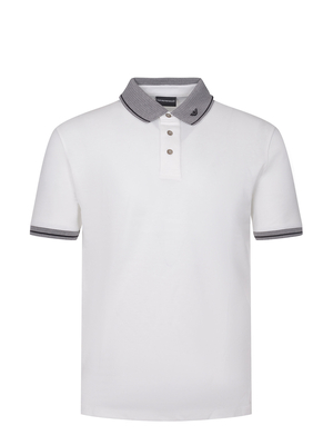 Polo Emporio Armani realizzata in Piquet di colore Bianco. Maniche corte. Colletto classico. Colletto e orlo con motivo a righe. Chiusura con tre bottoni sul davanti. Ricamo logo sul colletto a contrasto. Fondo con spacchetti laterali.100% cotone