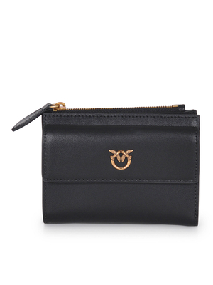 Portafogli Pinko " Compact" realizzato in pelle di colore Nero. Forma rettangolare. Interno con scomparti per banconote e carte. Esterno comprende due scomparti portamonete con chiusura zip e con patta personalizzata con piccola placca in metallo logo " Love Birds". Bottone a pressione centrale. Logo " Love Birds" ricamato sul retro. Altezza: 9 cm Larghezza: 3 cm Lunghezza: 13 cm 100% pelle