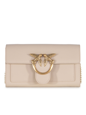 Portafogli Pinko " Love One Simply" realizzato in pelle di colore Beige. Chiusura con bottone a pressione nascosto. Logo " Love Birds Diamond Cut" in metallo Dorato, lettering " Pinko" inciso. Interno foderato in cotone. Lettering " Pinko" inciso. Interno diviso in scomparti. Tasca con zip. Spazi per carte. Tracolla in catena, Dorata. Logo " Love Birds Diamond Cut" ricamato tono su tono sul retro. Misure Altezza 10cm, Larghezza 5cm, Lunghezza 19cm Fodera 100% Poliestere 100% Pelle