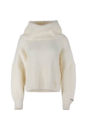 Pullover Pinko "Sphynx" realizzato in misto mohair lavorato a coste di colore Bianco. Collo ampio sciallato. Maniche lunghe. Giromanica sceso. Patch logo "Pinko" applicato sulla manica. 46%Acrilico. 28%Mohair, 19%Nylon, 7%Poliestere