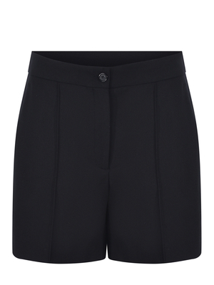 Shorts Pinko " Singapore" realizzati in twill di misto lana stretch di colore Nero. Linea dritta, leggermente ampia. Piega centrale. Chiusura con bottone e zip, nascosta. Tasche laterali. Inserto in pelle triangolare al centro dietro. Tasche a filo con bottone, sul retro. Fodera 100% Cotone 54% Poliestere, 44% Lana, 2% Elastan