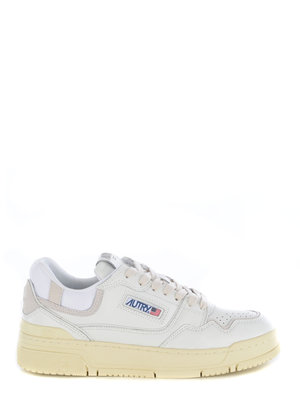 Sneakers Autry "CLC Low" realizzata in pelle di colore Bianco. Inserti a contrasto di pelle scamosciata di colore Beige. Collarino imbottito. Punta tonda, traspirante. Logo a contrasto sulla linguetta. Stringata. Lacci a contrasto Beige. Logo " Autry" applicato di lato. Logo sul retro. Soletta interna logata. Suola in gomma di colore Crema. Soletta rialzata di 2cm Suola 100% Gomma 100% Pelle