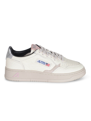 Sneakers Autry " Medalist Low" realizzata in pelle di colore Bianco. Collarino imbottito. Inserti in pelle scamosciata di colore Rosa antico. Punta tonda, traspirante. Patch logo applicato sulla linguetta. Stringata. Laccio tono su tono. Logo " Autry" applicato di lato. Logo inciso tono su tono sul retro. Tallone in pelle di colore Argento. Soletta interna logata. Fodera in pelle e spugna di cotone. Suola in gomma di colore Crema. Soletta in pelle logata, rialzata di 2cm Fodera: 40% Pelle Suina, 50% Spugna, 10% Nylon Suola 100% Gomma 100% Pelle