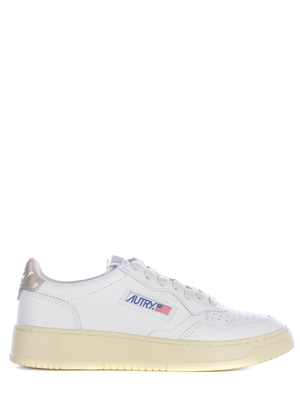 Sneakers Autry " Medalist Low" realizzata in pelle di colore Bianco. Collarino imbottito. Punta tonda, traspirante. Patch logo applicato sulla linguetta. Stringata. Laccio tono su tono. Logo " Autry" applicato di lato. Tallone a contrasto Platino. Logo inciso tono su tono sul retro. Soletta interna logata. Fodera in pelle e spugna di cotone. Suola in gomma di colore Crema. Soletta in pelle logata, rialzata di 2cm Suola 100% Gomma 100% Pelle