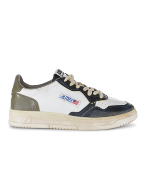 Sneakers Autry " Medalist Low" realizzata in pelle di colore Bianco/ Verde militare. Inserti in pelle di colore Nero sul davanti. Collarino imbottito. Punta tonda, traspirante. Patch logo applicato sulla linguetta. Stringata. Laccio color Crema. Logo " Autry" applicato di lato. Tallone e retro di colore Verde militare effetto crepato. Logo inciso tono su tono sul retro. Soletta interna logata. Fodera in pelle e spugna di cotone. Suola in gomma di colore Crema effetto vissuto. Soletta rialzata di 1.5cm Soletta in pelle logata, rialzata di 2cm Suola 100% Gomma 100% Pelle