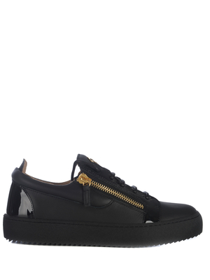 Sneakers Giuseppe Zanotti " Frenkie" realizzata in pelle di colore Nero. Inserti in vernice. Punta tonda. " Signature" in metallo Dorato sulla linguetta. Stringata. Laccio tono su tono. Chiusura con zip cerate, in metallo Dorato laterali. Suola in gomma di colore Nero. Logo impresso sul retro. Suola 100% Gomma 100% Pelle Made in Italy