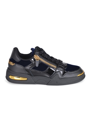 Sneakers Giuseppe Zanotti " Gz-ghost" realizzate in pelle di colore Nero/oro/navy. Dettagli laterali in velluto di colore Blu navy. Stringata. Doppia zip laterale di colore Dorato. Dettagli Dorati sulla Suola. Placchetta in gomma sulla linguetta logata. Suola 100% gomma 100% pelle Made in Italy