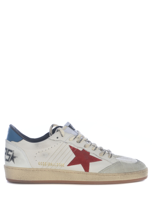 Sneakers Golden Goose " Ball Star" realizzata in pelle di colore Bianco. Inserti in pelle scamosciata Grigio. Effetto vintage. Punta tonda, traspirante. Patch logo applicato sulla linguetta. Stringata. Logo " Star" in pelle scamosciata Rosso, lettering "GGDB/BALL STAR" di colore Dorato, di lato. Tallone a contrasto di colore Azzurro. Lettering "SNEAKERS" Nero sul retro. Suola in gomma effetto consumato. Suola 100% Gomma 100% Pelle Made in Italy
