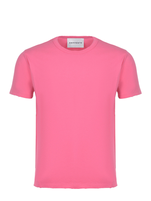 T-shirt Amaranto realizzata in cotone di colore Fucisa. Girocollo a costine. Maniche corte. Dettagli usurati. Ricamo sul fondo a contrasto.100% cotone Made in Italy