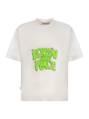 T-shirt Bonsai in cotone di colore Bianco. Girocollo. Maniche corte. Giromanica leggermente sceso. Lettering " Bonsai Happy Place" a contrasto Verde davanti. Patch applicato di lato. Vestibilità oversize. 100% Cotone Made in Italy