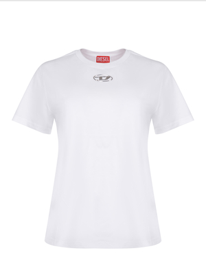T-shirt Diesel realizzata in cotone di colore Bianco. Girocollo a costine. Maniche corte. Dettaglio logo "D" a rilievo sul petto effetto gommato di colore Argento.100% cotone