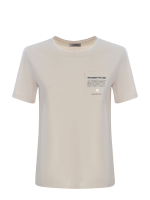 T-shirt 'S Max Mara " Sax" realizzata in jersey di cotone di colore Crema. Girocollo a costine. Maniche corte. Taschino applicato sul petto, stampe e ricami " Max Mara The Cube". Regular fit.100% Cotone Made in Italy