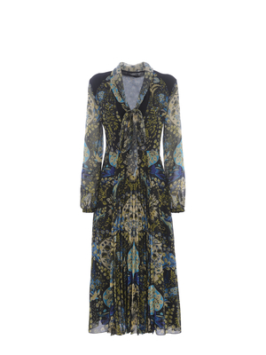 Abito Etro in georgette Multicolor. Collo alto con fiocco. Maniche lunghe. Stampa piazzata con motivi floreali e animali mitologici e Pegaso. Gonna plissé. Chiusura con zip laterale. Regular fit. Fodera 100% Seta Tessuto fantasia 100 % Poliestere 70% Viscosa, 30% Seta Made in Italy