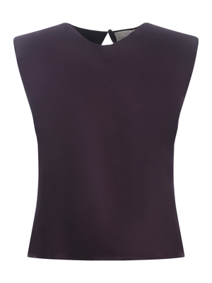 Top Forte Forte realizzato in raso di viscosa lucido di colore Viola. Girocollo. Senza maniche. Chiusura con bottoncino sul retro, leggero scollo ovale. Linea morbida. 58% Acetato, 42% Viscosa Made in Italy
