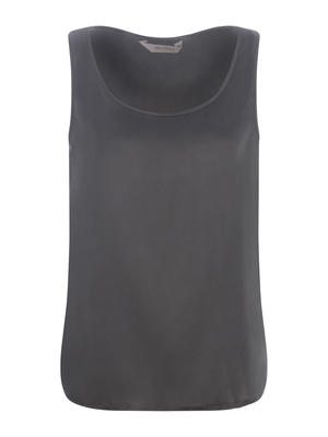 Top Max Mara Leisure "Pan" in raso in seta stretch di colore Grigio. Scollo rotondo. Spallina larga. Asimmetrico sul fondo. Linea fluida. 93% Seta, 7% ElastanMade in Italy