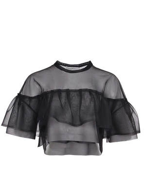 Top Philosophy realizzato in poliestere di colore Nero. Crop top. Interamente trasparente. Girocollo a costine. Maniche corte con balze. Balze sul davanti e sul retro.70% poliammide 30% poliestere