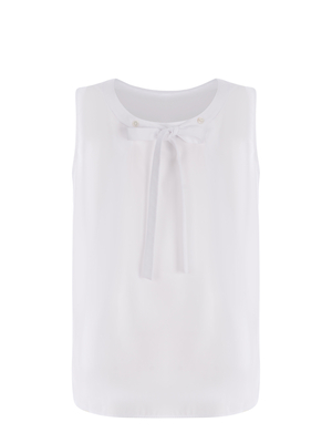 Top S Max Mara " Ofelia" realizzato in cotone di colore Bianco. Spallina larga. Giromanica. Dettaglio " Fiocco" da annodare sul retro. Spacchetti laterali. Fondo asimmetrico. Linea leggermente svasata. 100% Cotone Made in Italy